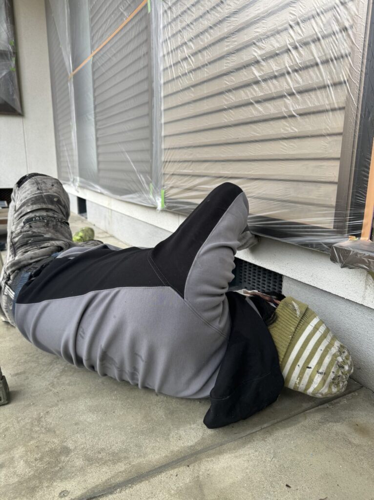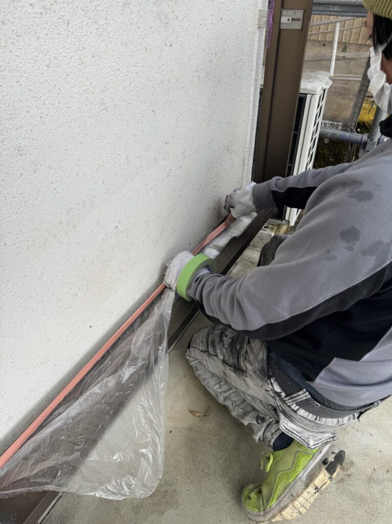テープが貼り終わると本格的に養生がスタート。飛散防止の為塗り替え以外の場所全てに養生をしていきます