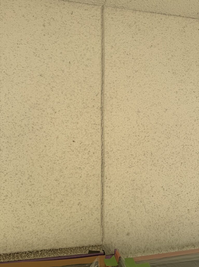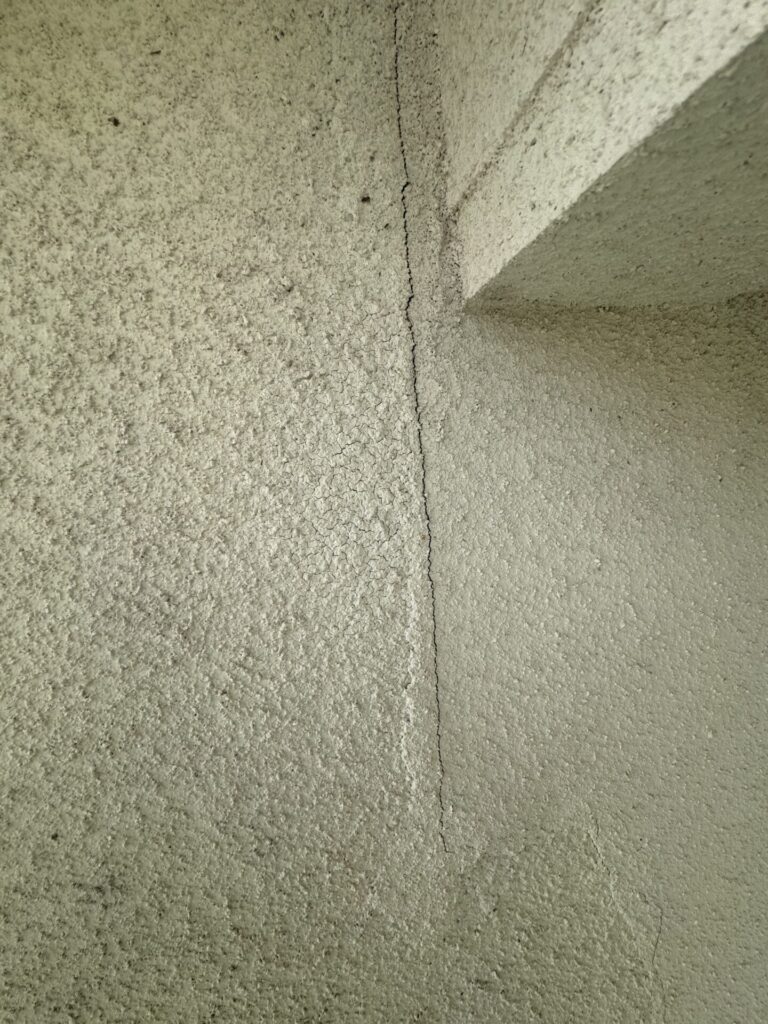 確認後ひび割れ箇所にコーキング材を打ち込んでいきます。リシン壁は表面が凸凹なので一度コーキングを打っても痩せる可能性があるのでコーキングが乾いた後にもう一度確認する必要があります